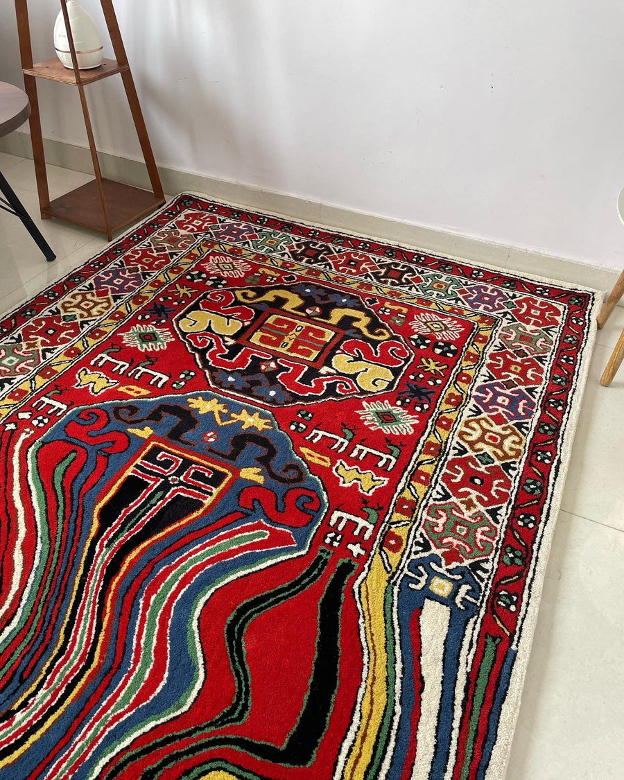 A true masterpiece.nnDimensions: 7*4.5 Feetn? Material: 100% New Zealand Wooln? Quality: 4000 GSMn? Hand Tuftedn? Style: Cut-Pilen? Highly Skilled Craftmanship